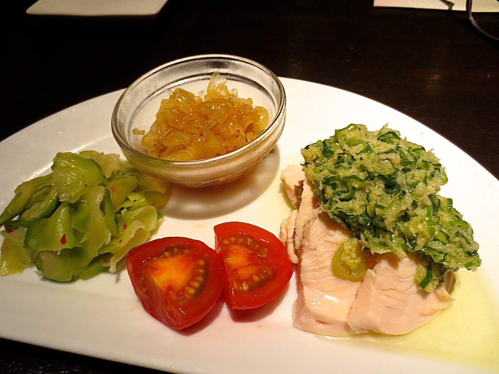 全てに2人前一皿で出て来る様です。 前菜三種盛り くらげ、生ザァー菜、蒸し鶏。 ザァー菜があっさりと漬けてあり生と言う事も有って食感も良く美味しかったです〜♪