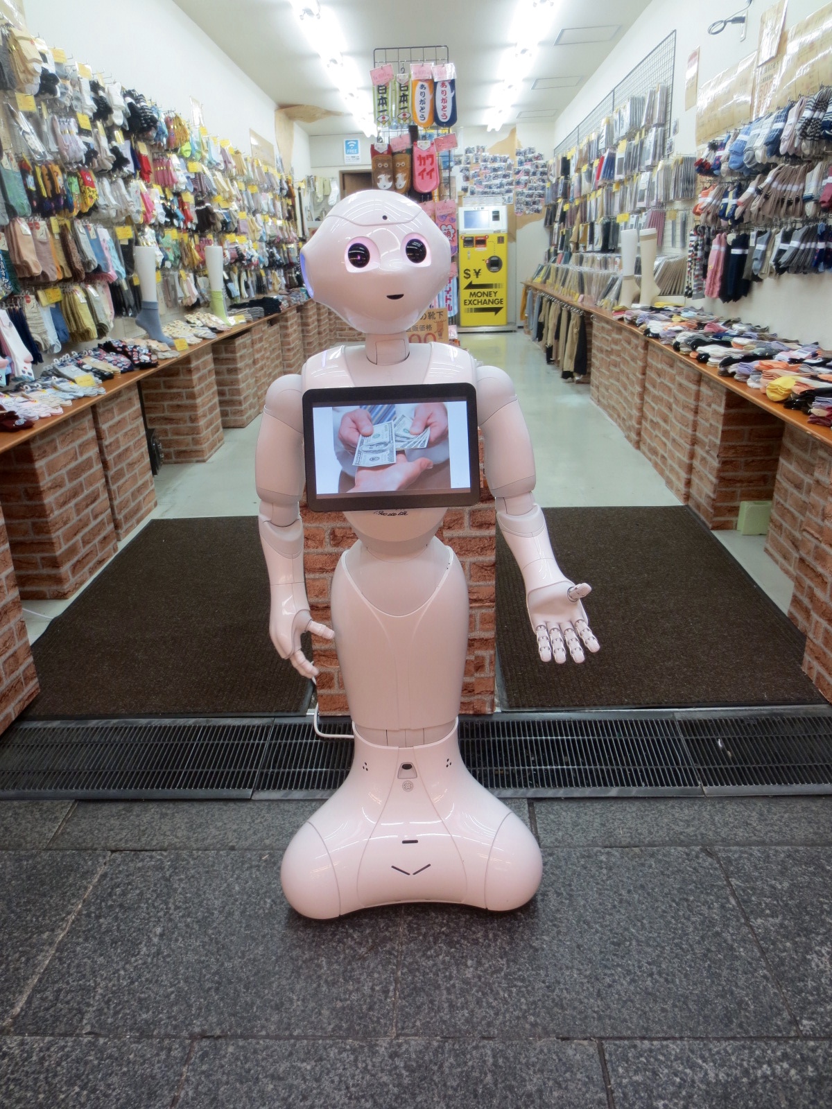 ここのお店は、靴下屋さんなんですが、『アイロボット ペッパーくん』が何カ国語の言葉で両替の案内をしています……。